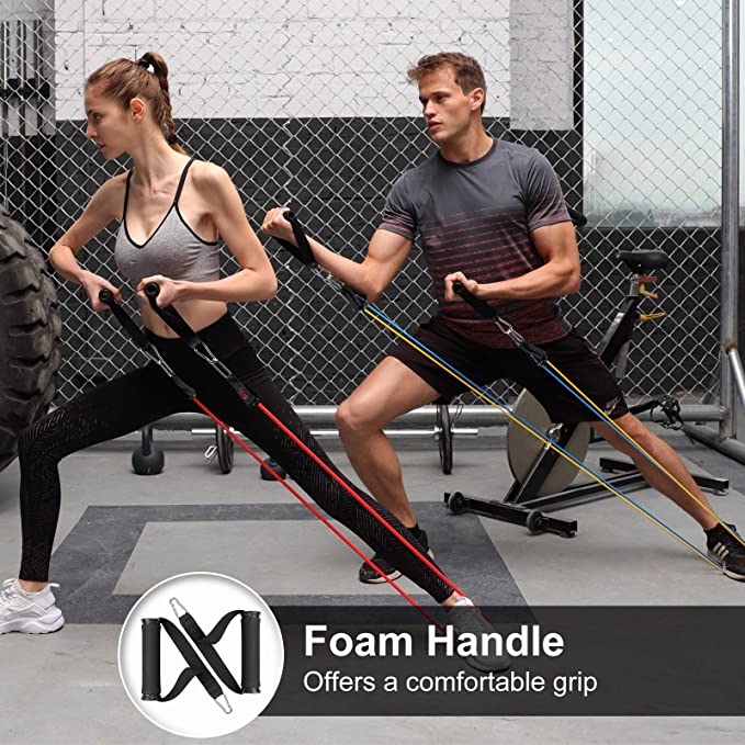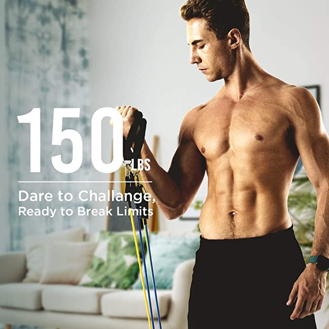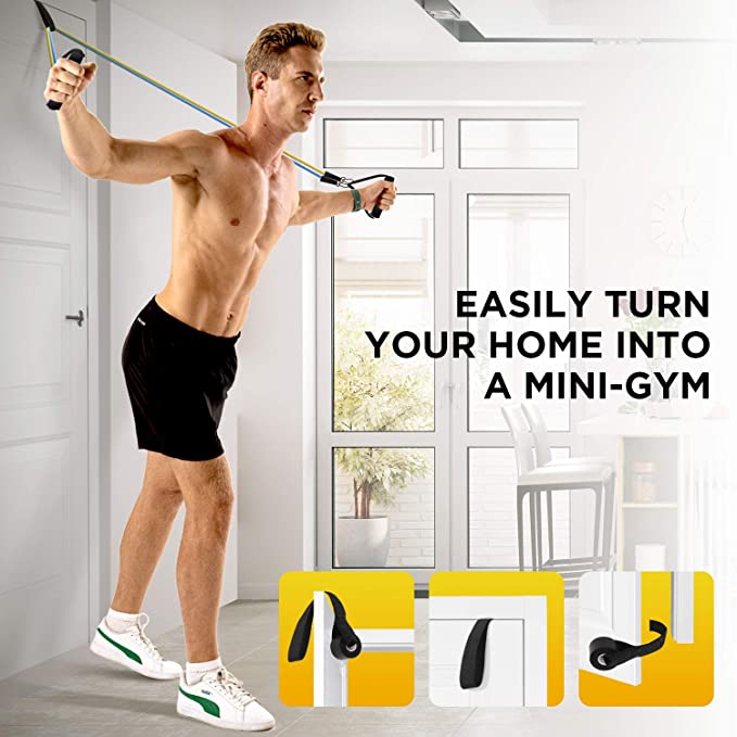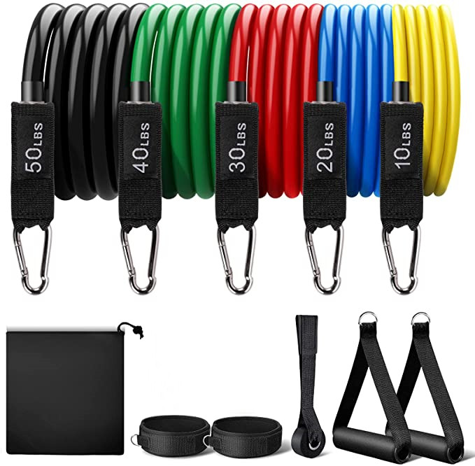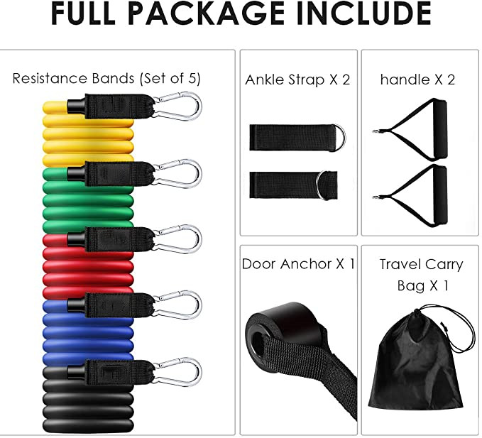 [Package contains] 11 Piece resistance set includes 5 expansion tubes with different resistance, 2 handles, 2 ankle straps, 1 Door Anchor and 1 strap handbag.