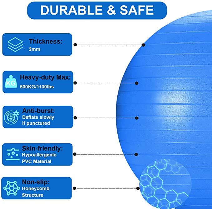 【 Premium Material】: honeycomb-structure, & heavy-duty PVC material, this exercise ball has a strong bearing capacity (Max. 500 kg 1100lbs). The spiral design on the surface prevents you from slipping, ensuring your safety when you are using it. The eco-friendly and skin-friendly premium material is soft, and it is easy to fold up and store when not in use.